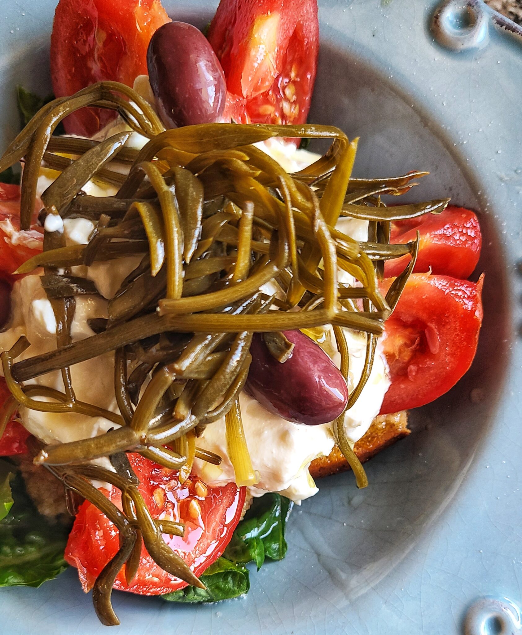 - Top with a mound of pickled samphire and drizzle with olive oil.