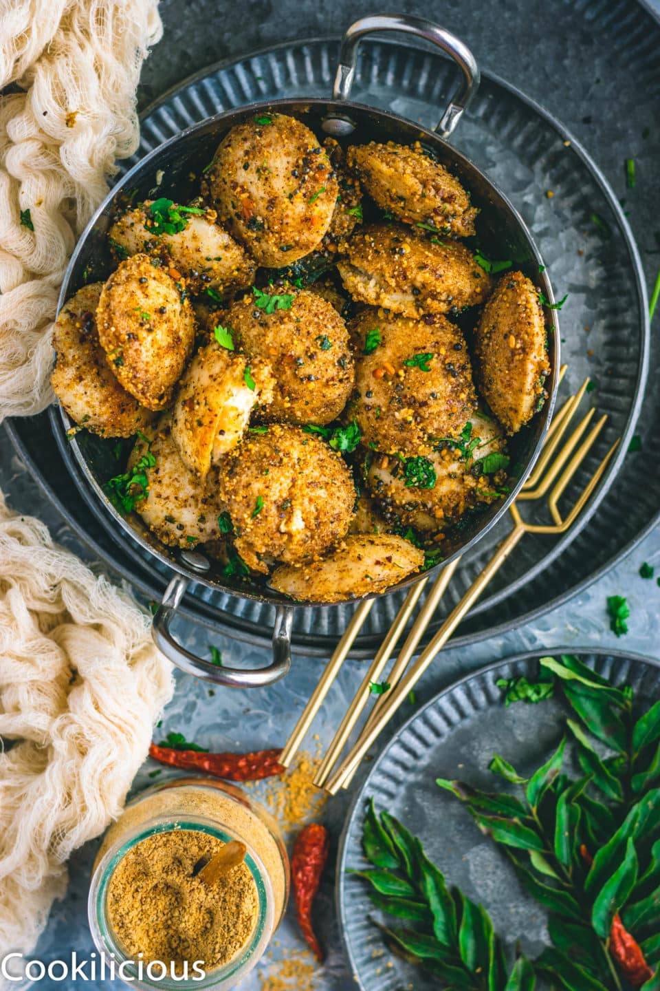 Mini Masala Idli is an alternate fun way to enjoy idli. These steamed cakes are seasoned with molagapudi and gunpowder and make a delicious vegan appetizer or snack!