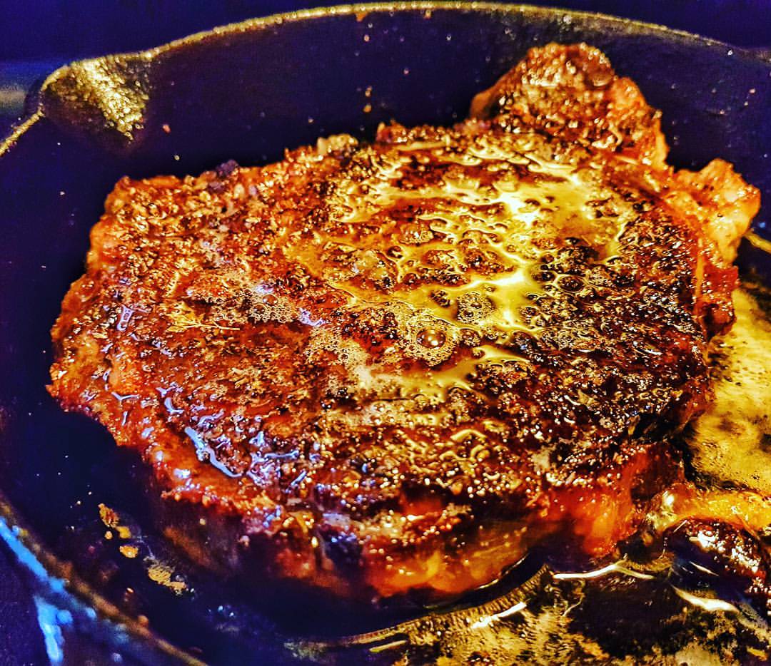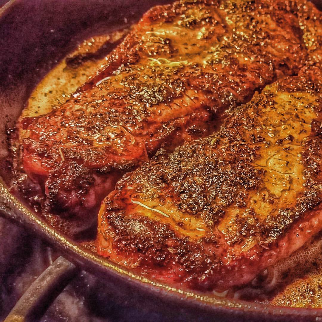 - Add a splash of vegetable oil and slap your steak(s) down and sear 1-2 minutes a side or until a deep golden-brown crust has been achieved.