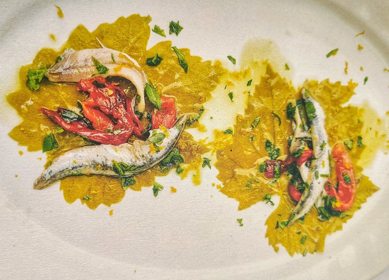 Gavros Marinatos (White Anchovies) On Grape Leaves with Garlic, Red Pepper, Parsley, Evoo