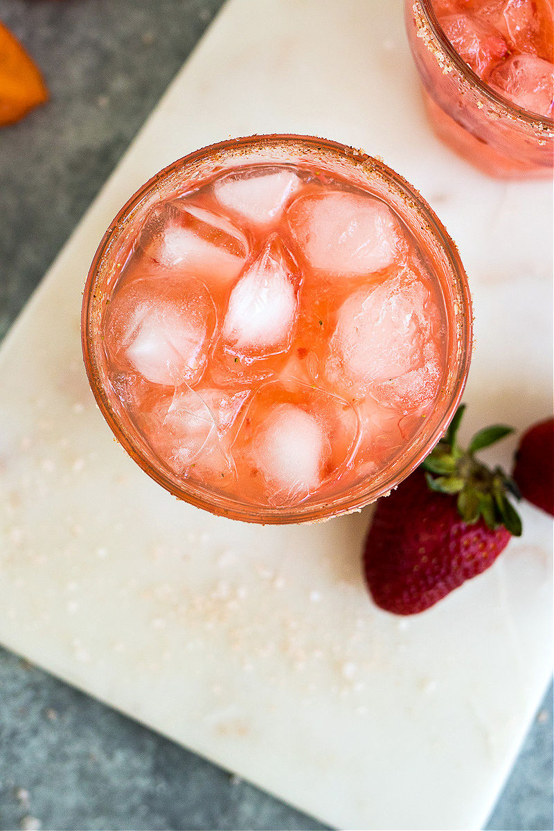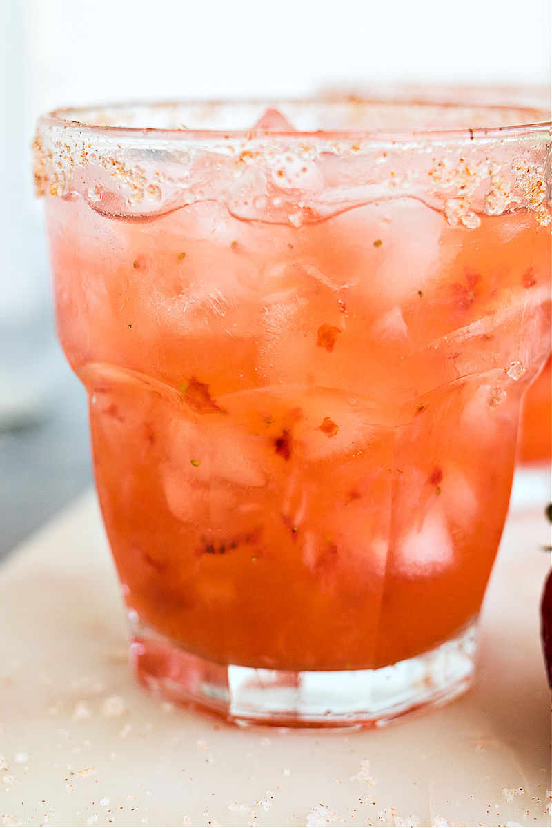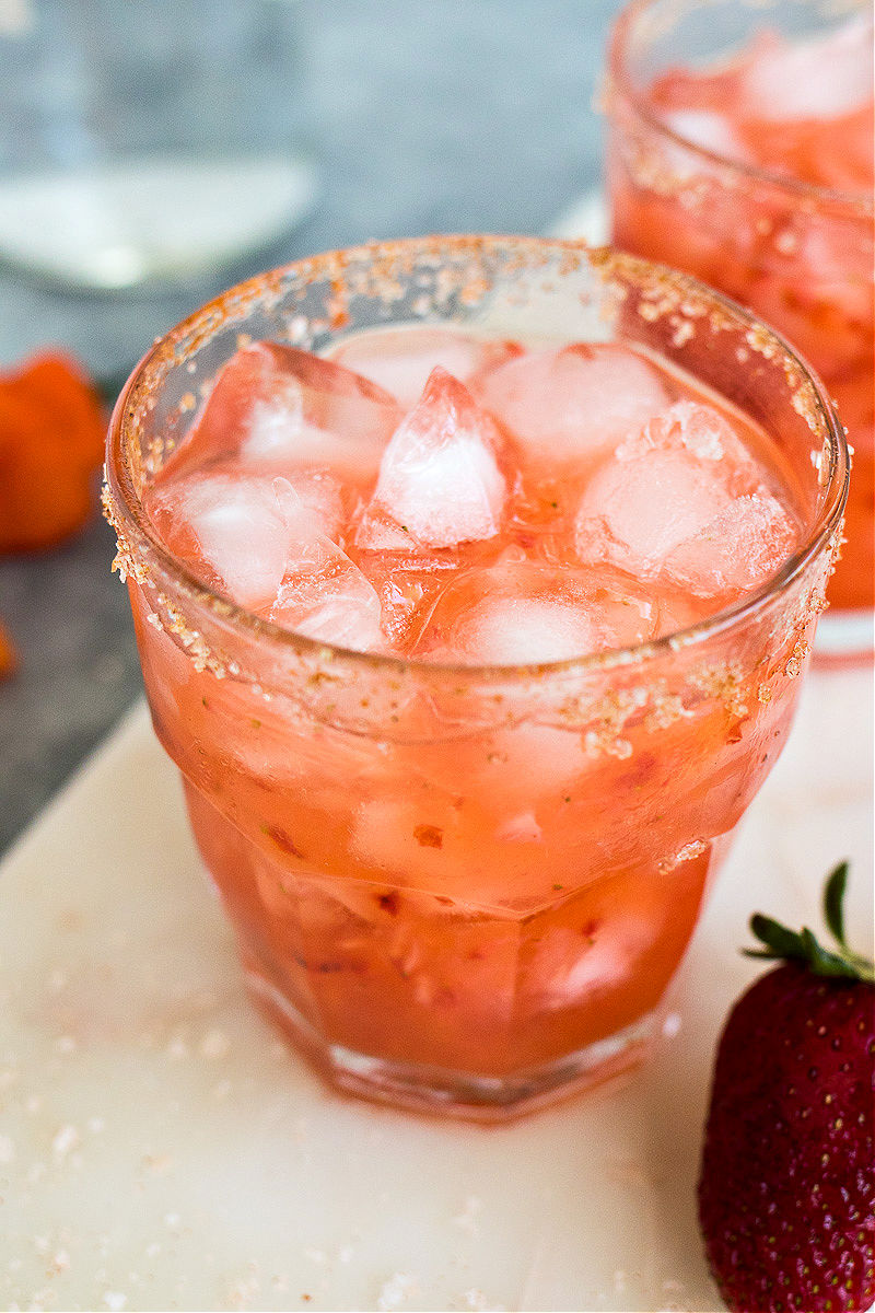 Strawberry Habanero Margarita - Strawberries and small amounts of habanero are muddled together and shaken with lime juice, agave, and tequila before pouring over ice