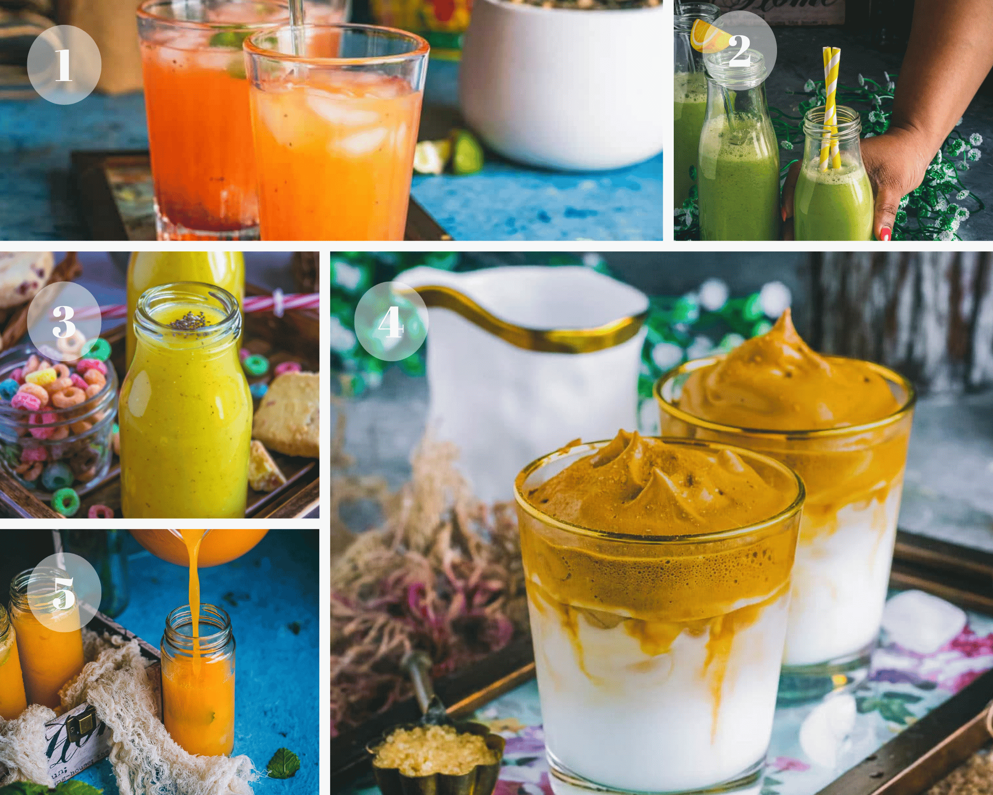 1. Rose Lemonade | Orange Lemon Sherbet2. Cucumber Flavored Vegan Buttermilk | Chaas3. Kiwi Smoothie Recipe - Post Holiday Detox4. Dairy Free Dalgona Coffee5. Carrot Orange Cantaloupe Juice