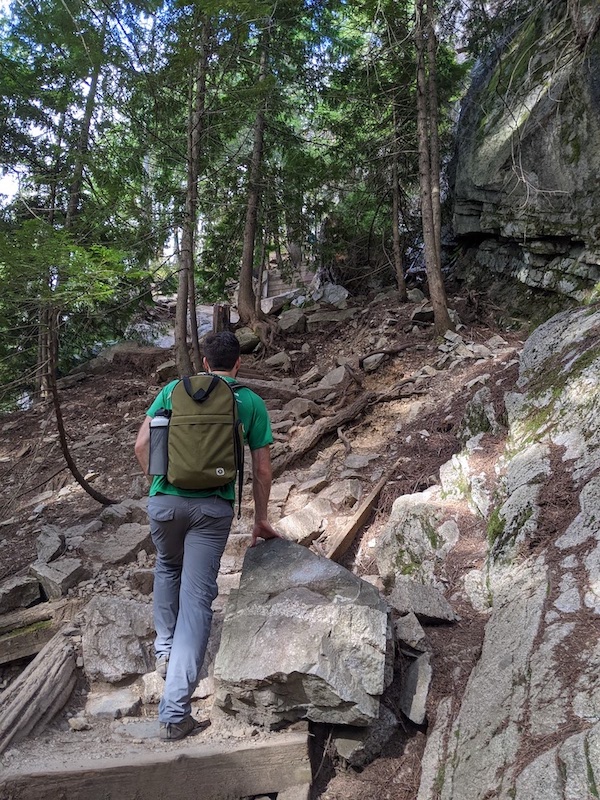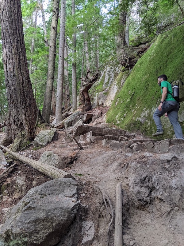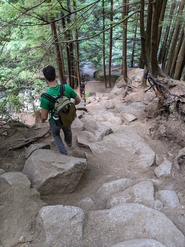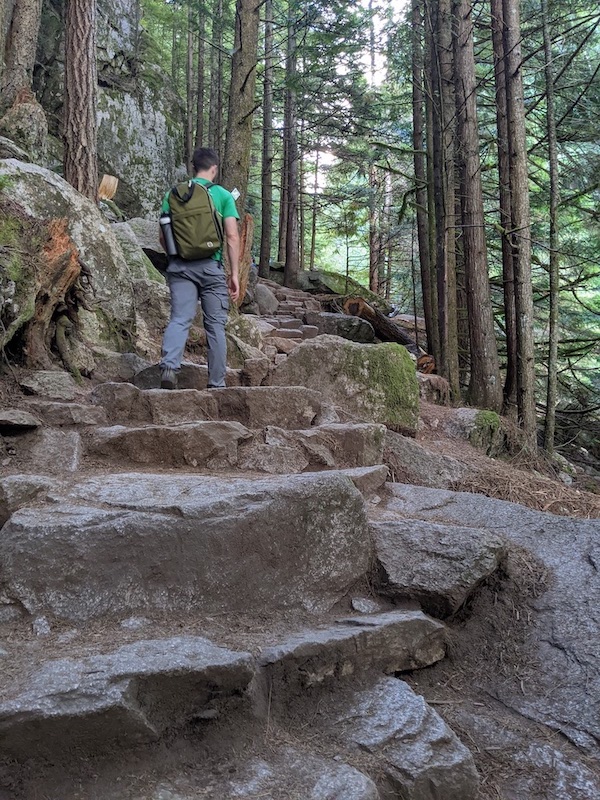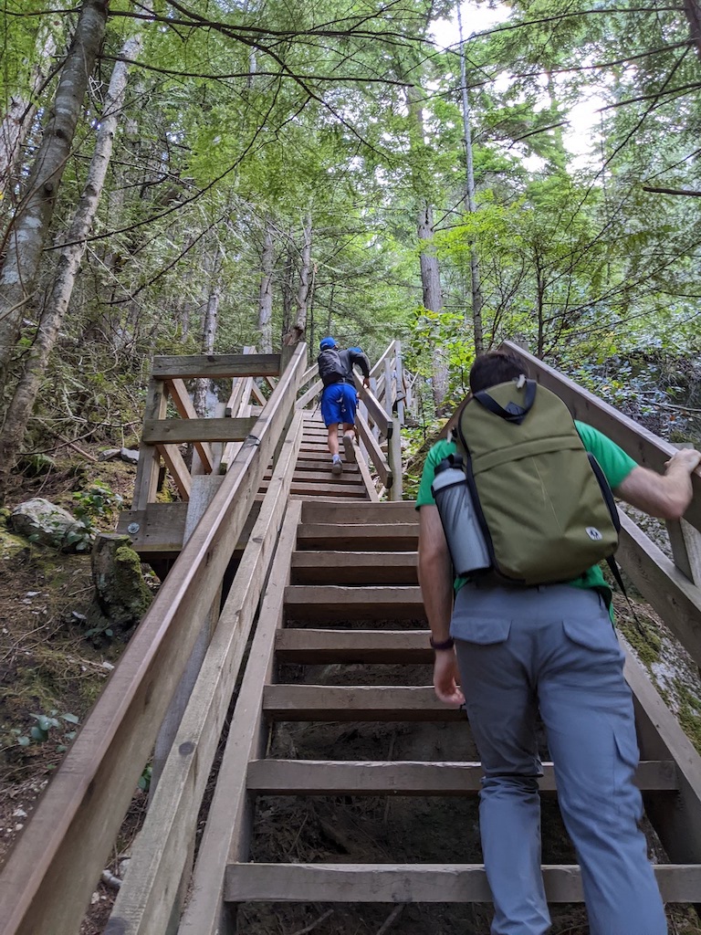 Then the rock stairs followed but the wood stairs led us to the start of the trail in what seemed like a matter of minutes. We completed the trail at 1130AM clocking us at two and a half hours. Without stopping, we hit a water bottle filling station before heading straight to the car as we were starving and could not wait to reward ourselves with tasty food in Squamish.