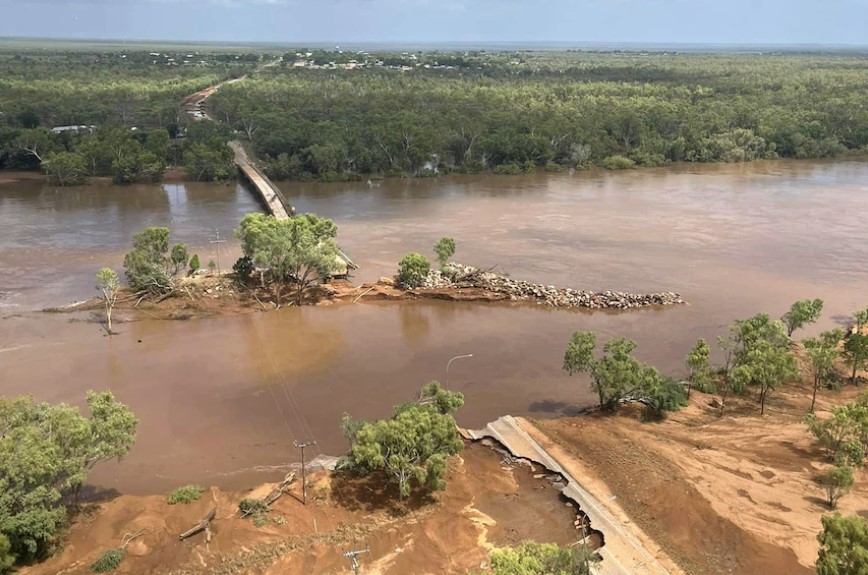 Part of the Great Northern Highway bridge across the Fitzroy River at Fitzroy Crossing appears to have completely washed away. Photo: Neville Ripp. Image source: ABC News, 9 January 2023.