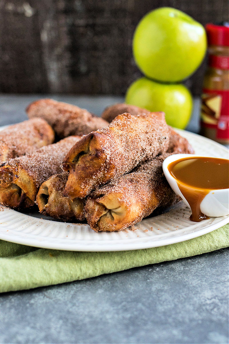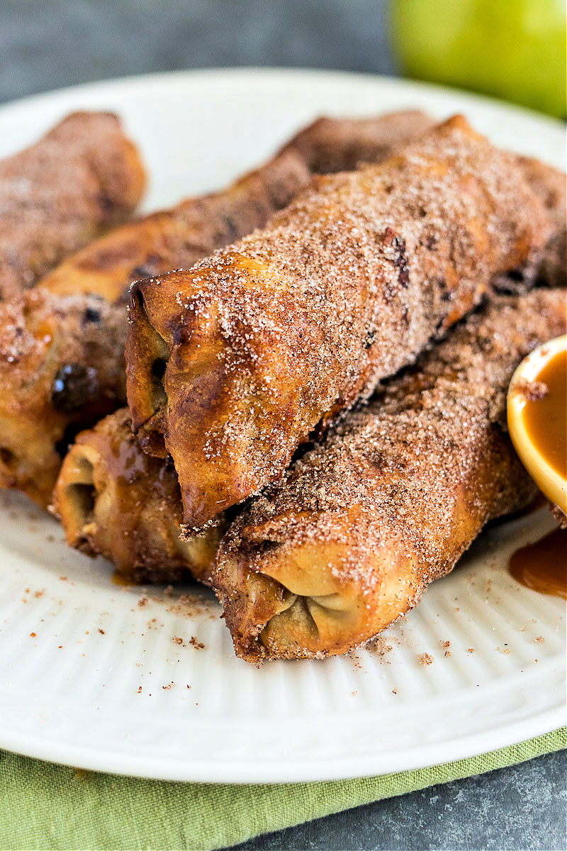 Apple Pie Egg Rolls - Cinnamon apples are rolled into an egg roll wrapper with a little cream cheese and air fried until crispy. They are finished with a roll in cinnamon sugar.